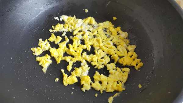 4.起鍋加油,炒入雞蛋液,然後不停地翻炒,炒成大小均勻的小塊後盛入盤中備用。