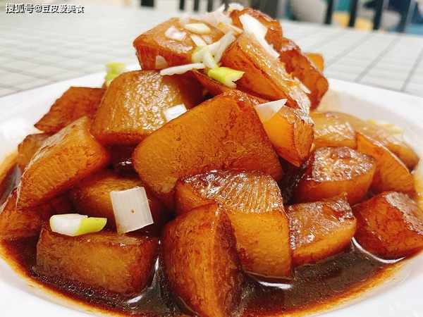 3、起鍋燒油,油熱後下入焯煮好的白蘿卜塊,大火快速翻炒片刻,再下入1勺老抽,2勺生抽,2塊冰糖,繼續翻炒片刻。