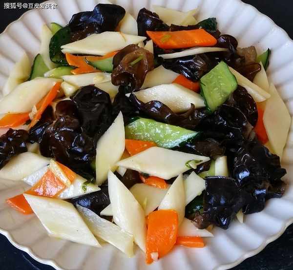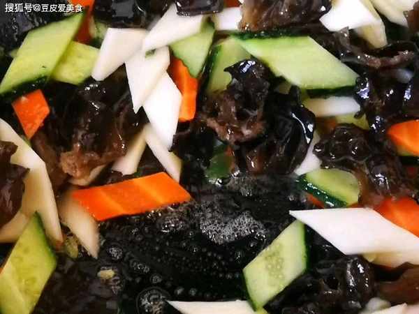 1、山藥去皮,洗凈,切成菱形片。(如果對山藥過敏,記得戴個手套再操作),木耳用水泡發,撕成小片,胡蘿卜去皮,洗凈,切成片,黃瓜切小塊。