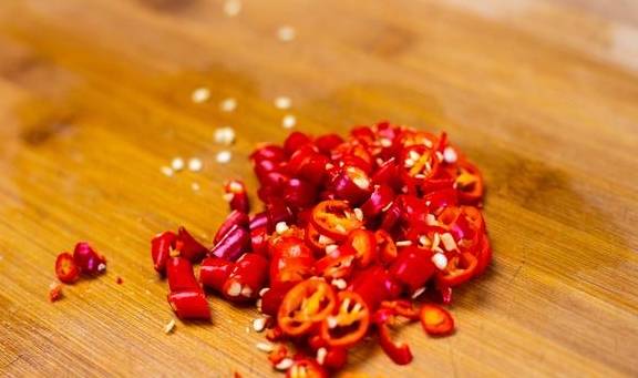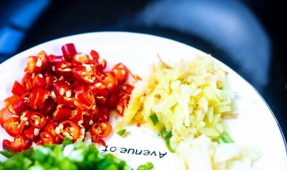 18:油熱後倒入薑末和少許的小米椒爆香。