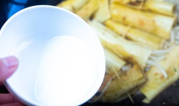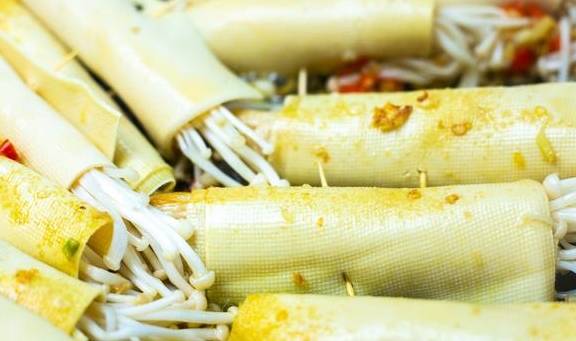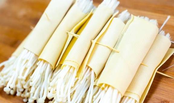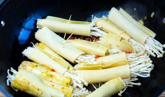 10:用豆皮將金針菇裹起來,用牙簽從中間穿過固定。