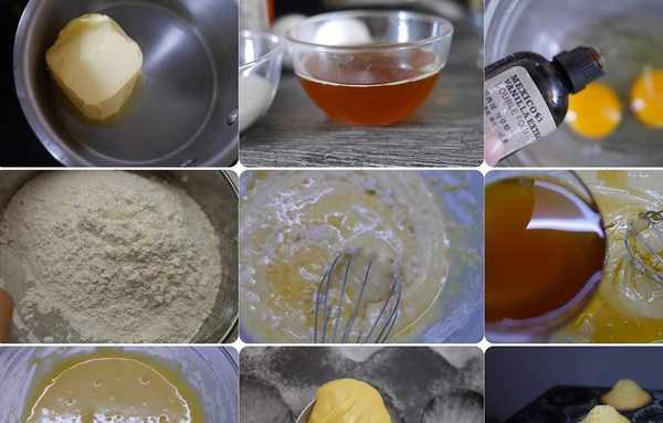 首先將奶油用小火煮成焦化奶油瀝渣備用,另外將雞蛋加入香草精,砂糖打發成輕柔蛋液,然後篩進面粉及小蘇打,攪拌至無結塊,最後加入焦化奶油慢慢拌勻,稍微靜置15分鐘,最後在模具上抹油,灑粉,再舀上面糊依照溫度時間烘烤。
