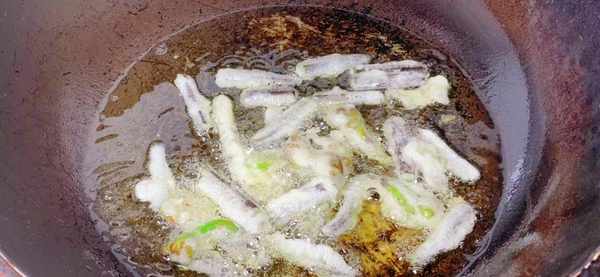 油炸食品盡量用玉米油,炸出來的食物口感好吃。鍋中倒入適量的玉米油,油溫7成熱,把裹滿面糊的蕨根段一個一個夾入鍋中,小火炸,把蕨根段炸熟炸金黃撈出來控油,再撒上一些孜然粉食用就可以。