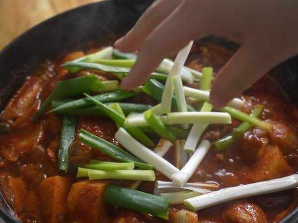 6、煮到馬鈴薯熟得差不多時再放蔥,最後煮到蔥變軟時,美味的辣燉雞就完成。