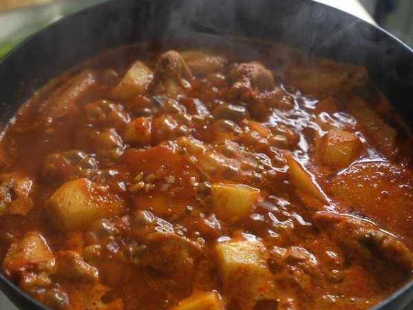 4、馬鈴薯切比較大塊煮熟的時間要長一些,等湯煮至沸騰時放入馬鈴薯煮10分鐘左右,中途不時攪拌一下避免雞肉沾鍋。