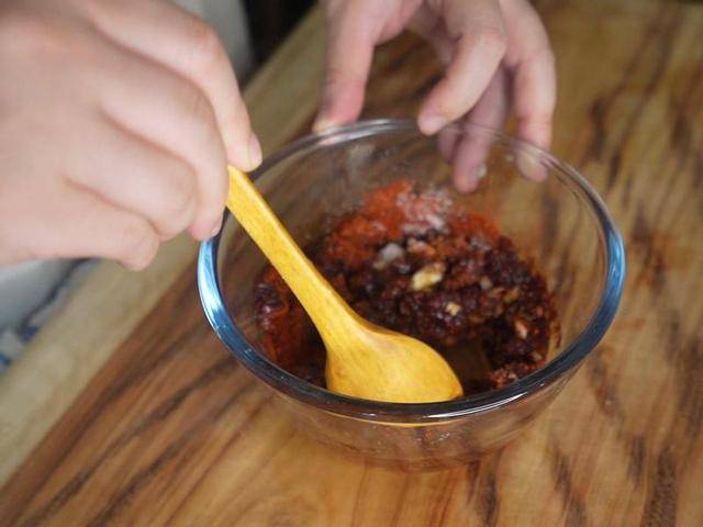 醬料:辣椒粉4匙、糖2匙、醬油7匙、果寡糖或玉米糖漿2匙、蒜末3大匙