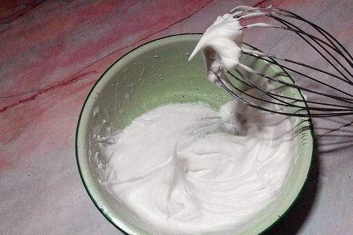 白糖分三次加入蛋清中,用打蛋器打至能提起一個堅挺的小勾兒即可。三次加白糖分別是:起大泡;大泡變密集小泡;出現紋路。