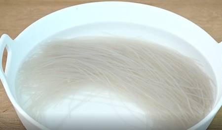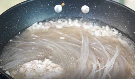 首先準備一個大一點的盆子,將粉絲平鋪在盆子底部,先往裡面放入一些開水,水要沒過粉絲,直到把粉絲泡軟。再往裡面加入適量的清水,用溫水繼續泡粉絲,泡約1—2個小時。將粉絲泡至無硬心,吸足水分即可。