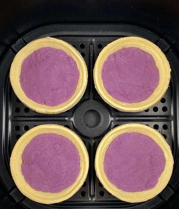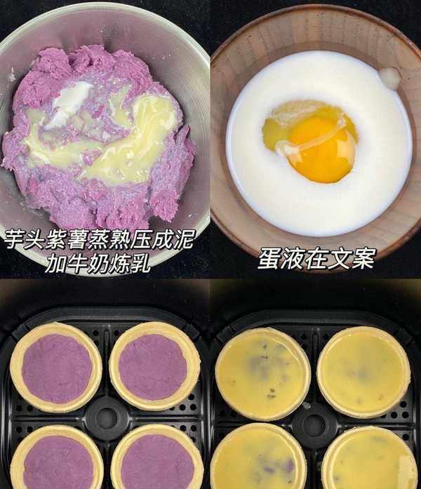 將蛋撻皮放入烤盤中,倒入芋泥,再倒入蛋液;