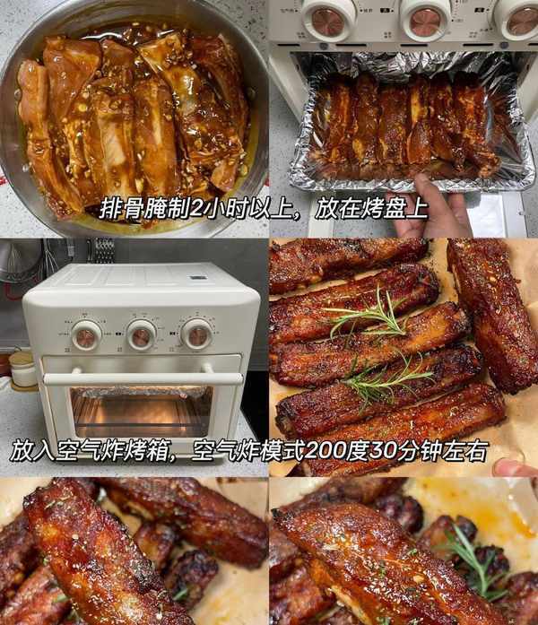 將醃制好的排骨放在烤盤上,放入空氣炸烤箱選擇空氣炸模式。