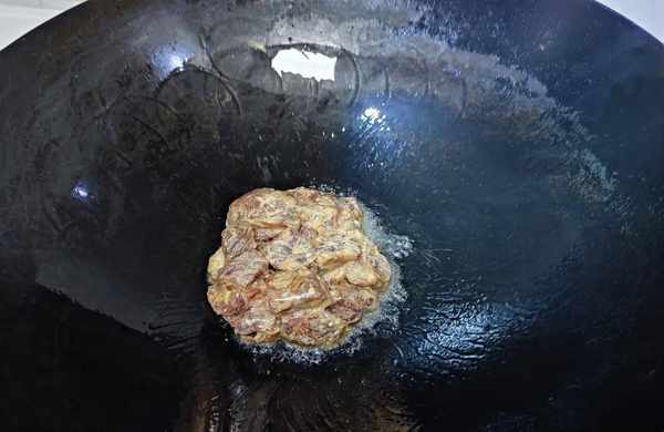 5.牛肉粒下鍋後要用小火慢慢炒,用鏟子將它攤開,這樣子可以更好地炒入味,炒至鍋中的牛肉粒像下圖這樣子焦黃的狀態;