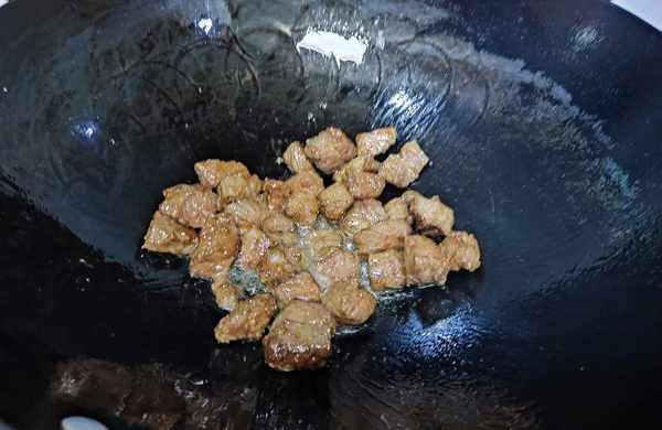 鍋中倒入油,用油潤一下鍋身,接著將醃好後的牛肉粒倒入鍋裡面,下鍋後用鏟子翻動一下,這樣子可以更好地將牛肉粒炒均勻;