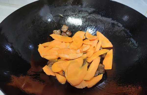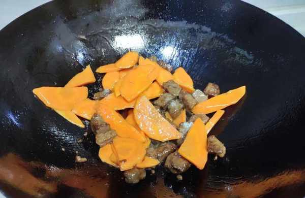 6.接著我們將焯水後的胡蘿卜片也倒入鍋裡面,胡蘿卜片下鍋要用鏟子翻動,多翻炒。炒胡蘿卜的時候用中小火慢炒,因為胡蘿卜不容易煮熟,炒的過程中沒有汁水,小火炒容易將它炒熟,且不容易煮焦;