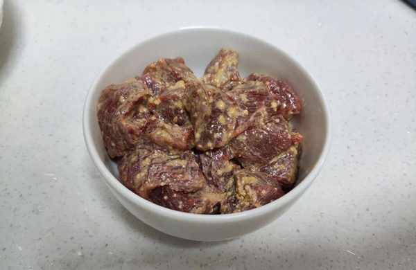1.牛肉放著洗凈,切成丁。切好的牛肉粒放在碗裡面,再用清水稍微沖洗一下。洗好後倒掉水分,往裡面加入適量的醬油,食用油,淀粉。用手給它大力抓勻,放著醃個20分鐘,使其更為入味;
