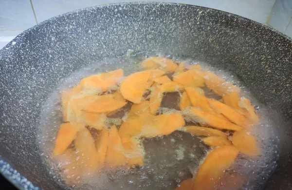 3.鍋中倒入水,一勺食用油,然後將鍋裡面的水煮開。水開後把切好的胡蘿卜片放入鍋裡面。經過焯水後的胡蘿卜顏色會更加鮮亮好看,焯水後的胡蘿卜撈出放在一旁;