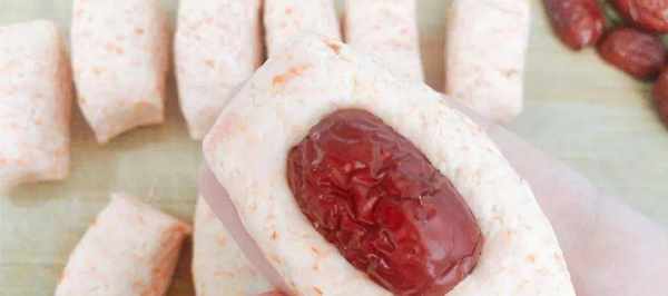 3.然後將面團整理成長條狀,切成小段。紅棗洗凈,把紅棗放在面團中間,給它整理好;