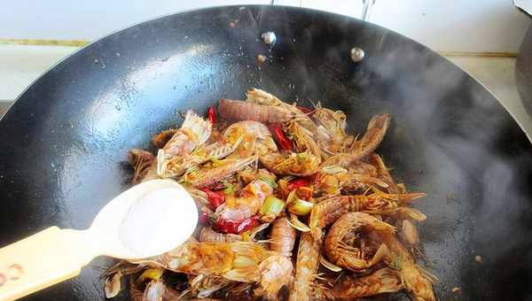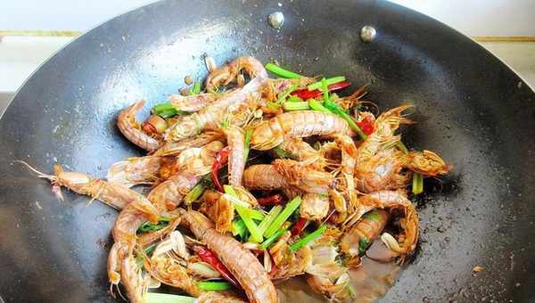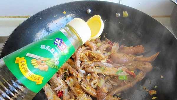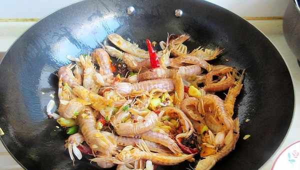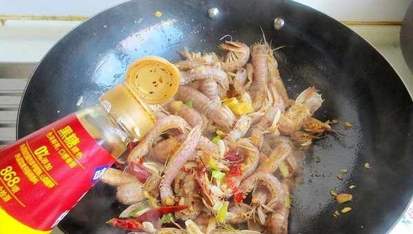 5、加皮皮蝦翻炒均勻上色