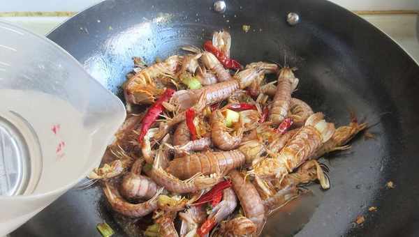 8、加水(不能超過皮皮蝦)翻炒均勻,中小火翻炒燒5分鐘左右(看重量)入味