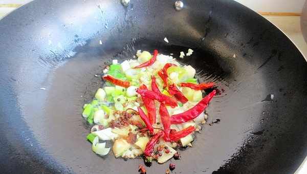 3、熱鍋涼油,油熱7成下蔥薑蒜翻炒出香味,加花椒粒和辣皮子翻炒出香味