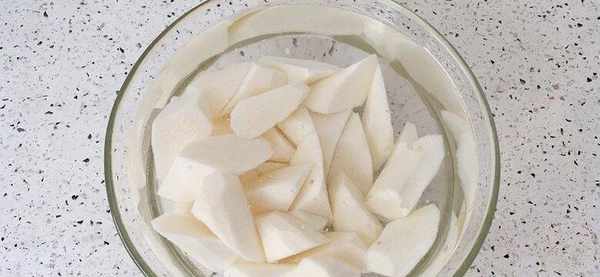3、山藥去皮,洗凈切成滾刀塊,泡水中備用。