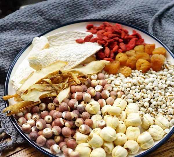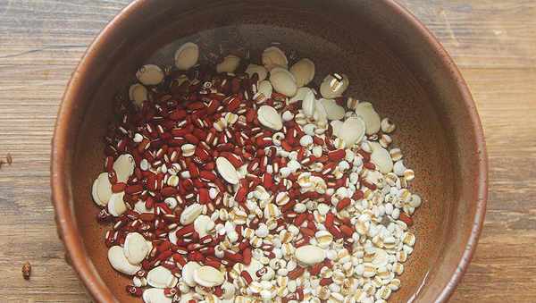 1黨參、當歸、紅棗、薏米、茨實、山藥幹、赤小豆、眉豆、枸杞、洗凈浸泡備用,