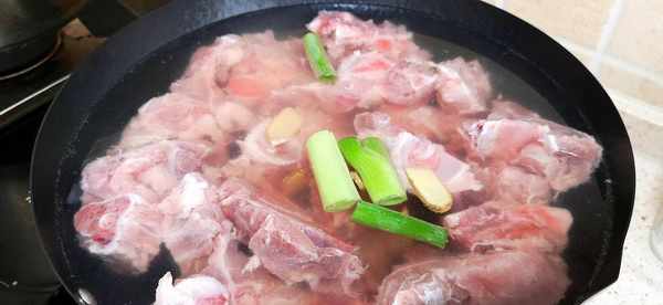 2豬骨冷水下鍋放薑片、大蔥、料酒焯水後撈出洗凈血沫瀝幹水分備用,