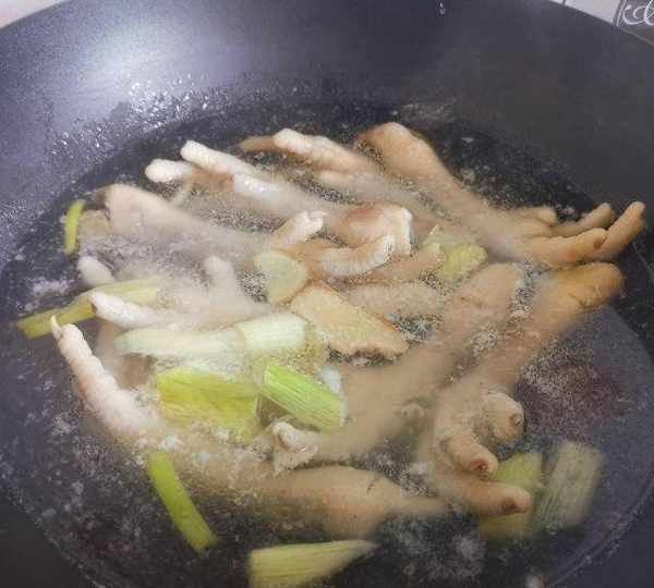 2、雞爪清洗幹凈,去指甲,冷水下鍋,加入料酒和薑大䓤,大火煮開1分鐘,然後撈出瀝幹。雞爪焯水。