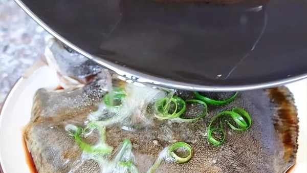 7、起鍋倒入適量的食用油,把油燒熱至輕微冒煙後,均勻地澆在剛剛擺好盤的魚身上。這樣一道氣質鮮美、營養可口的清蒸多寶魚就做好瞭。