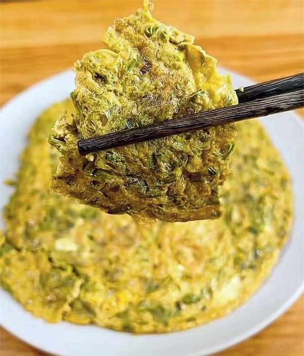 步驟三:平底鍋刷點油,把面糊倒入鍋中,煎至兩面熟透即可。香椿獨特的氣質夾雜著雞蛋的香味,咬一口都是田間的氣質,特別清香。