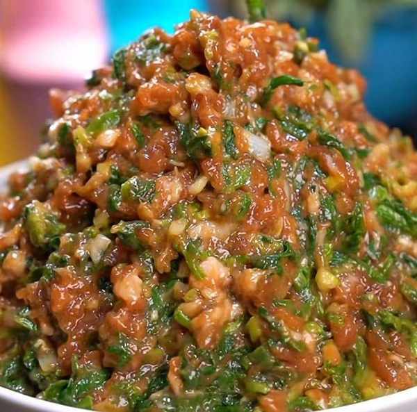 步驟三:開始給餡料調味,根據餡料的多少,加適量的雞精、胡椒粉、白糖、一點香油、一勺蠔油、一勺生抽、一個雞蛋、一點熟油,繼續攪拌均勻,攪拌至上勁。再加入薺菜碎,一勺鹽,再次攪拌均勻即可。這樣的肉餡包出來的餃子,每次都要吃一大碗,特別的出味。