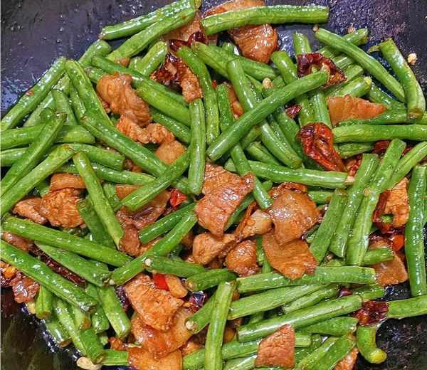 ③倒入豆角翻炒,倒入適量老抽,把豆角炒至斷生,鍋中加適量水,大火收汁,加適量鹽翻炒均勻即可