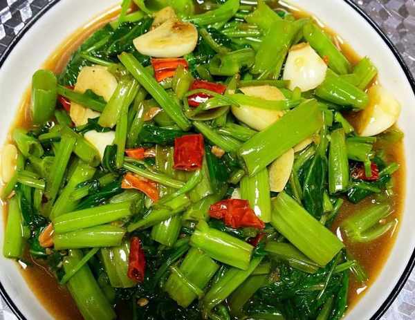 ②鍋中放入適量油,放入大蒜和幹辣椒爆香,倒入空心菜翻炒出汁,加入適量鹽,翻炒均勻,炒至斷生即可