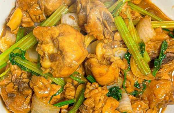 4.大火煮開以後,轉中過燉煮15分鐘,然後把芹菜和洋蔥放入,大火翻炒收汁,即可出鍋開吃。