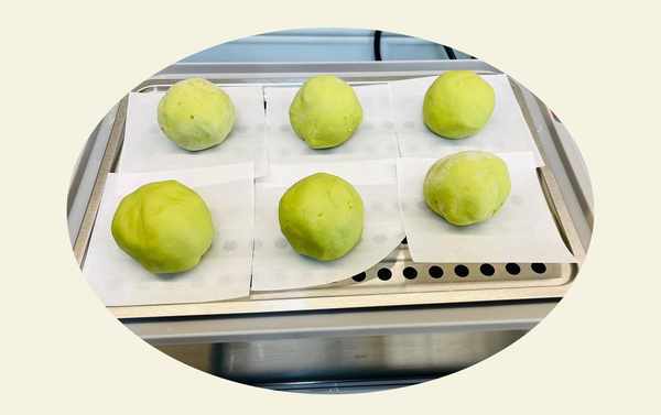 澄粉90g,開水150g,糯米粉300g,糖45g,豬油15g,艾草泥270g,小蘇打2g,肉松90g,咸蛋黃9個