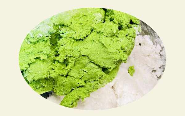 1,鍋內水時尚艾草和小蘇打,煮2-3分鐘後撈出,清洗幹凈後攪打成泥