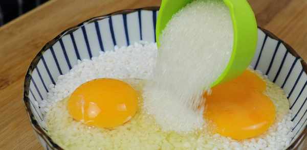2、把浸泡好的大米瀝幹水分,裡面打入兩個好看的雞蛋,加入一大勺的白糖,白糖的量可以依據個人的口味再適量的增減,放在一旁備用。