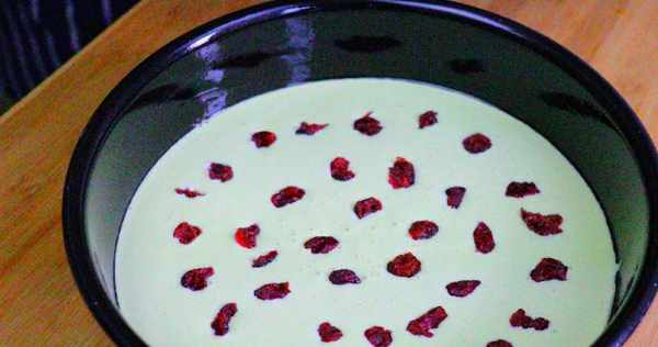 6、準備一個模具,裡面刷上適量的油防粘,把米糊倒在裡面,上面鋪上一層蔓越莓,也或者用其他的幹果代替,比如葡萄幹也或者是紅棗,放進蒸鍋中再次醒發半個小時。