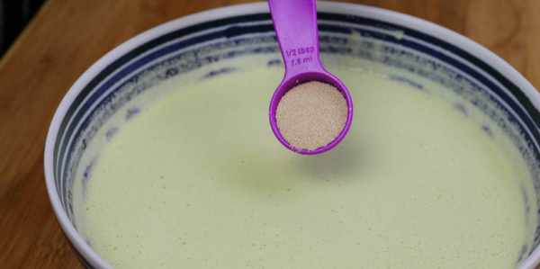 4、榨好之後倒在大一點的盆中,加入六克酵母粉,用筷子多攪拌一會,把酵母粉攪拌融化,然後蓋上蓋子,密封醒發至兩倍大。
