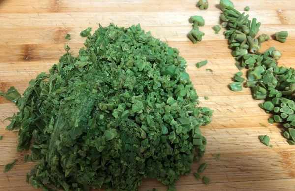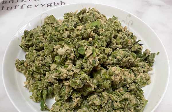 2、撈出過涼水瀝幹水份,放在案板上切去老根的部分不要,將剩餘的切成碎末,焯水後過涼水可使香椿口感更好。