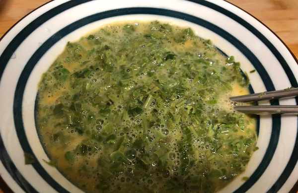 3、取1個大碗,碗中打入5顆雞蛋,加入少許食鹽增加底味,用筷子攪打均勻,將切好的香椿末放入蛋液中。