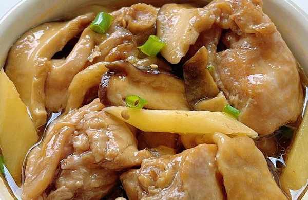 1.雞腿清洗幹凈,然後剁成小塊,放入大碗中,接著清洗幹凈香菇,然後切成薄片,也放入大碗中,接著加入薑絲和適量的玉米淀粉、生抽、花生油,再抓拌均勻,醃制20分鐘備用。