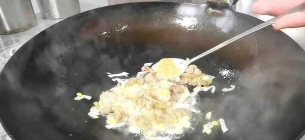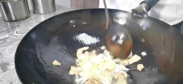 咱們放入蔥花和蒜片,把料頭香味炒出來,蔥蒜下鍋炒至30多秒,把蔥蒜的香味爆出來瞭。