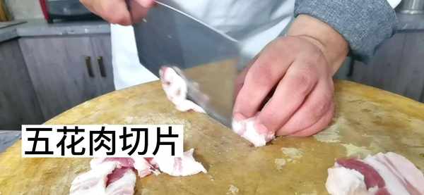 咱們準備點五花肉啊,去皮五花肉啊,切成片兒,厚度大概在0.2厘米啊好,先放到盆裡邊。