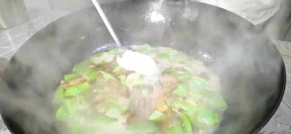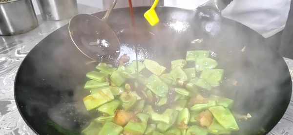 豆角下鍋煸炒一分多鐘,兩分鐘左右。把豆角由淡綠色煸炒制成深綠色的狀態,然後咱們加入開水,再放入四克精鹽調底味。
