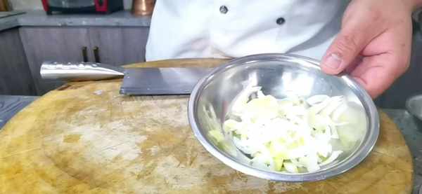料頭咱們切點蒜片,準備點大蔥,從中間破一刀,然後斜刀切成寬條,蔥花稍微多放一點啊好,跟蒜放在一起。