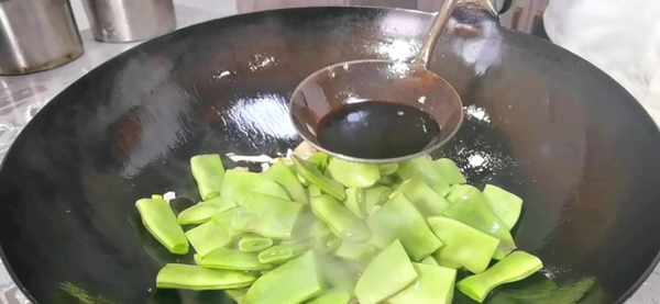 東古一品鮮醬油,加入30克提味增鮮,哎,然後簡單翻炒兩下,要把豆角炒香,把它的豆腥味揮發出去。