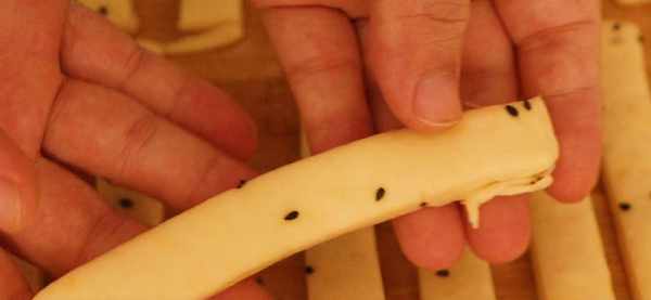 6.接著再撒點黑芝麻上去,用搟面杖稍微搟幾下,讓它粘更牢。