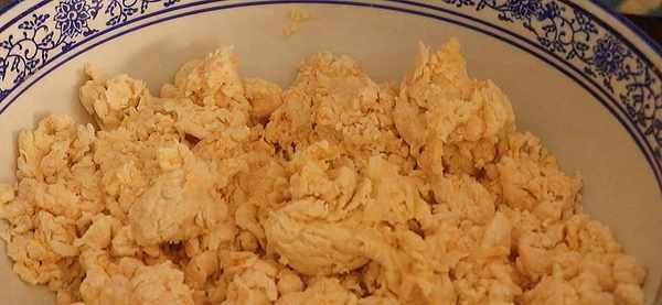2.100克玉米面跟200克面粉放入盆中,攪拌均勻,再磕入一個雞蛋,攪拌均勻,然後用前面調好的酵母水和面,一邊倒一邊攪拌,攪拌成面絮狀。