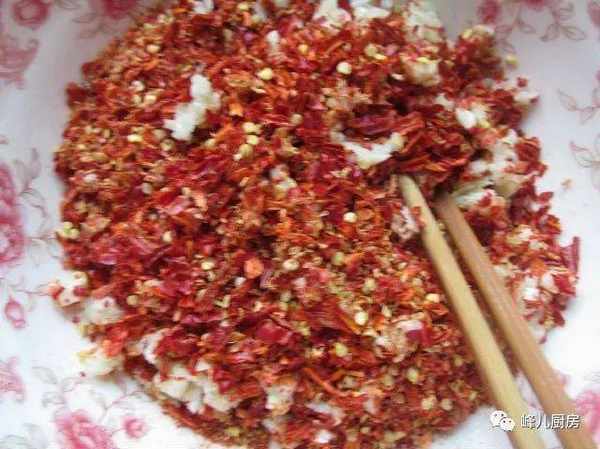 3、把蒜末,鹽,醋和辣椒末一起攪拌好。