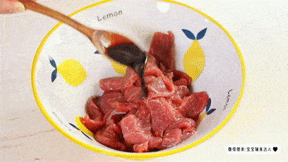 肉片裡加上1勺醬油、鮮菇粉和適量的淀粉,抓勻,既能提味也有嫩肉的效果。